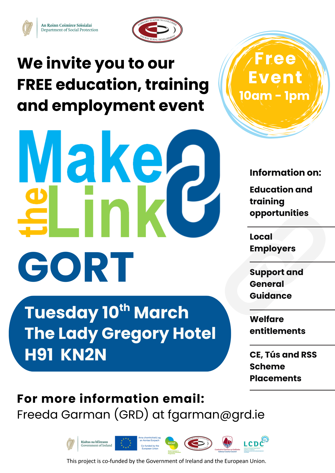 Galway Rural Development and the Department of Social Protection are joining forces to put together a series of FREE information events called “Make the Link” that will showcase education and training courses available in your local area. There will also be local employers, and information on the financial support and benefits available to you.