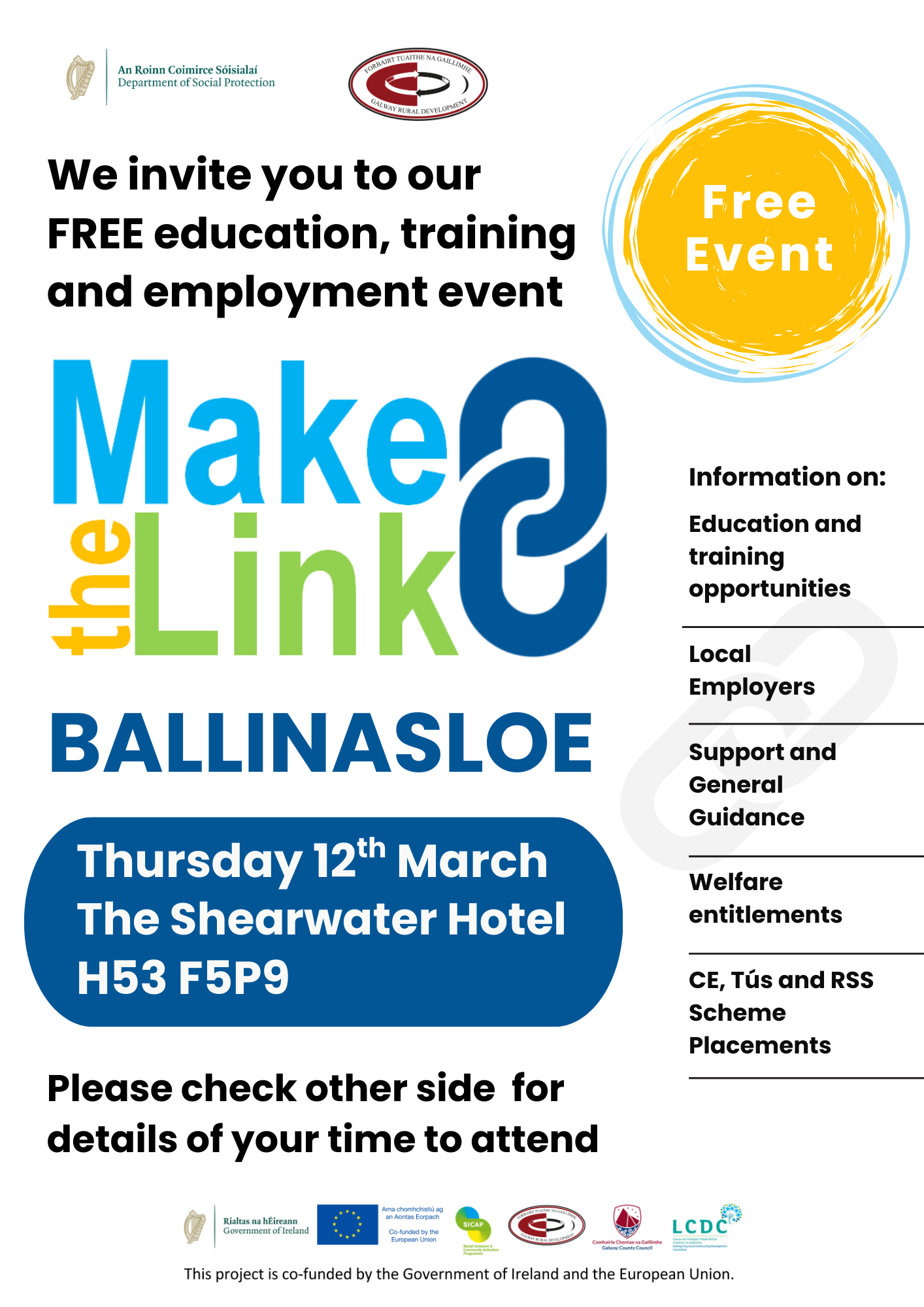 Galway Rural Development and the Department of Social Protection are joining forces to put together a series of FREE information events called “Make the Link” that will showcase education and training courses available in your local area. There will also be local employers, and information on the financial support and benefits available to you.