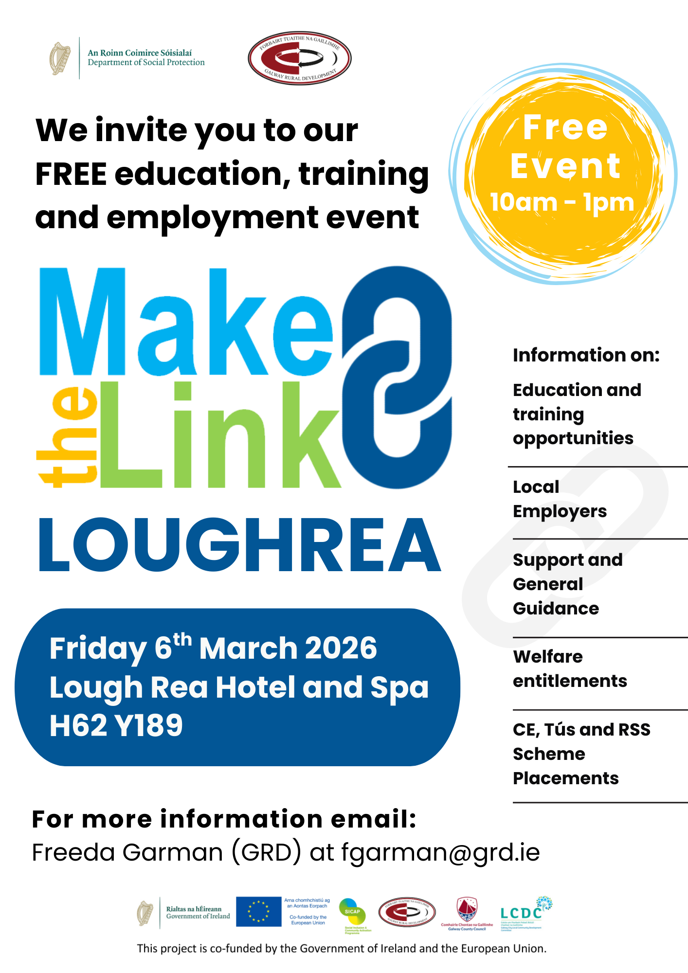 Galway Rural Development and the Department of Social Protection are joining forces to put together a series of FREE information events called “Make the Link” that will showcase education and training courses available in your local area. There will also be local employers and information on the financial support and benefits available to you.