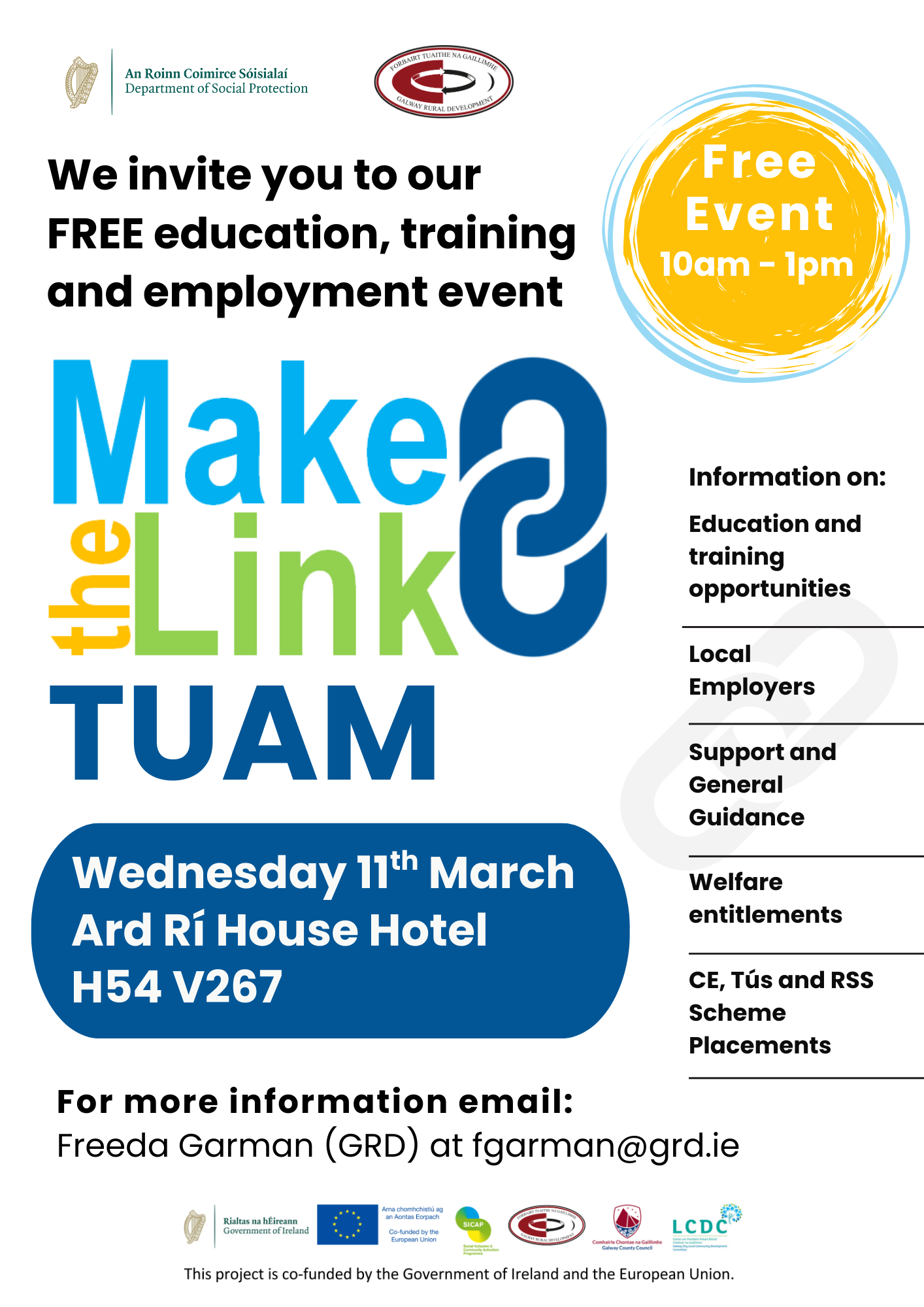 Galway Rural Development and the Department of Social Protection are joining forces to put together a series of FREE information events called “Make the Link” that will showcase education and training courses available in your local area. There will also be local employers, and information on the financial support and benefits available to you. This event will be held in Tuam on the 11th March from 10am to 1pm in The Ard Rí House Hotel.