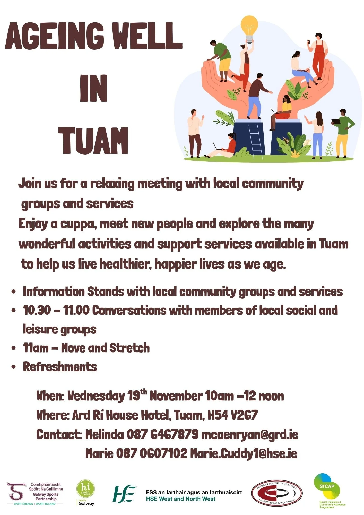 Enjoy a cuppa, meet new people, and explore the many wonderful activities and support services available in Tuam to help us live healthier, happier lives as we age.